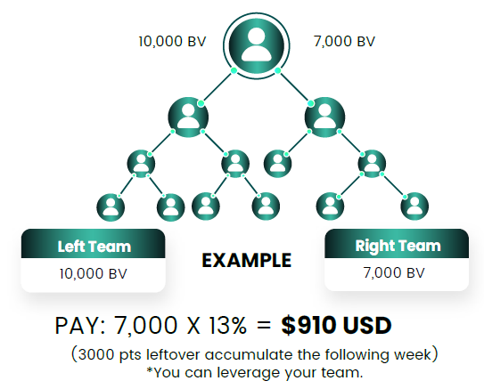 The Binary Bonus is a core component of the compensation plan, based on a two-legged team structure (a left leg and a right leg). You earn a percentage of the sales volume from your lesser-volume leg. This encourages you to build a balanced team and support the growth of both legs of your organization. This bonus is paid weekly.