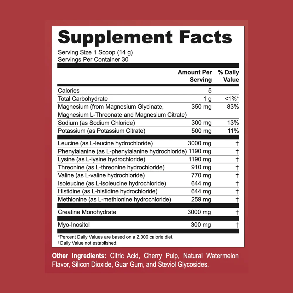 PERFORMANCE+ is an advanced formula designed to boosting energy, strength, and muscle recovery. It combines creatine monohydrate, essential amino acids, Myo-inositol, and electrolytes that help maintain hydration and physical performance. The amino acids support protein synthesis and muscle regeneration, while magnesium, potassium, and sodium contribute to neuromuscular balance and cognitive function. With a refreshing watermelon and cherry flavor, it offers a delicious and functional way to recharge and sustain your energy.